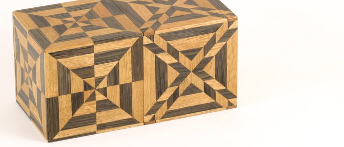 戦後、沖山木工を再開した時に、先代から秘密箱の作り方を教わりました。それ以来、ずっと秘密箱ばかりを作り続けていました。からくりは伝わっているものもありますが、考えるものです。54回秘密箱を作った時には「昔は10回がいいとこだ」と言われました。昔の秘密箱は、裏面が動かなく片面でしたが、それでは回数が増えないから両面を動かすようにして回数を増やしました。 その後、従来の秘密箱の開け方を新しい開け方を考案してきました。