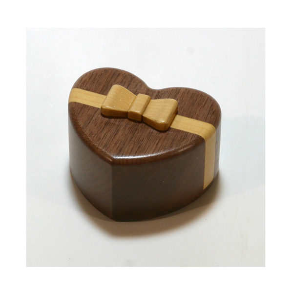前作の「ハ-ト3」(P-3-3)は2000年のからくりクラブ会員向けクリスマスプレゼントとして製作されましたが、今回は仕掛を少し簡単にして一般商品として開発しました。 リボンは新たに付けました。 P-3-5の収納部には布を貼りました。 (「暮らし」をテーマとする展示会に向けて制作された作品です。)