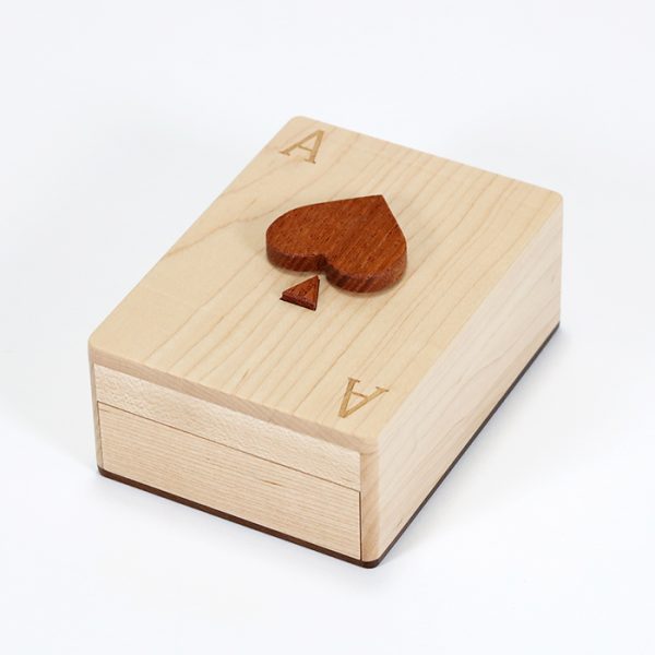前回よりサイズをひとまわりほど大きくし、トランプが箱ごと入るようにしました。 宮本達雄の「幸運のトランプ」(MY-8)をデザインとサイズを変更してリメイクしたものです。 箱の表面にはスペードが見えていますが、幸運と言えばやはりハートマークでしょう。