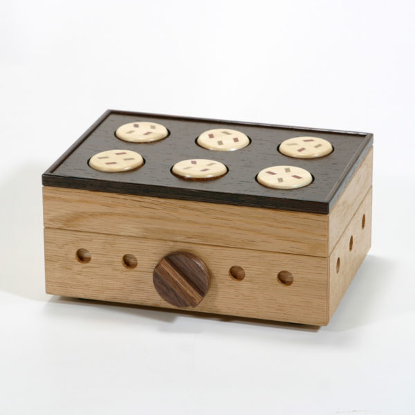 お祭りの屋台などで見るたこ焼きは、その美味しさはもちろん、たこ焼きをひっくり返すあの素早い手さばきも魅力的です。 この作品は家庭用のたこ焼き器がモデルです。下段の引出には鍵がかかっています。鉄板の上にはまだ焼けていないたこ焼きが6個並んでいます。たこ焼きは、くるっとひっくり返すと焼き上がった状態になります。全てのたこ焼きをうまく焼き上げることが出来るでしょうか?