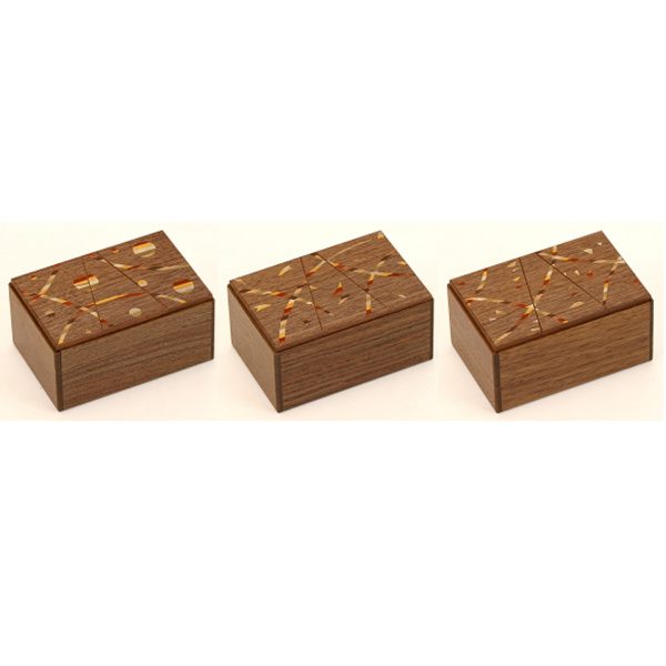 乱寄木風のデザインに仕掛を組み込みました。4回で開きますが、難しくはありません。「大川式秘密箱」の仕掛が応用されています。仕掛を動かした状態が、デザイン的に面白味があると思います。