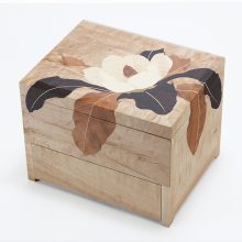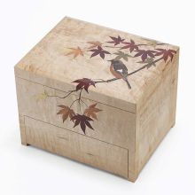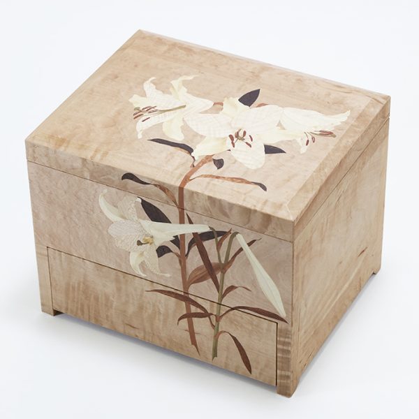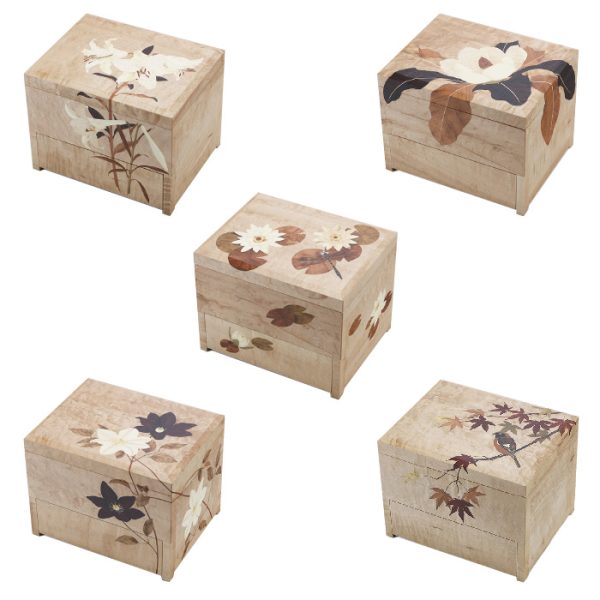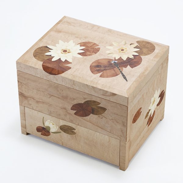 この作品は、1982年に作られた宝石箱(F-8)をベースにして、外装も仕掛けもかなり変更をしました。 象嵌細工は蓮尾さんが特に手をかけて作りました。これまでよりも素晴らしい仕上がりです。 一方、仕掛けはより緻密なものになりました。