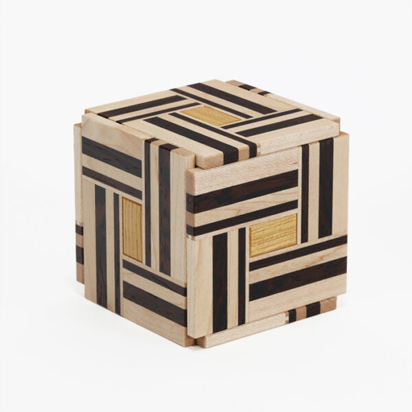 2013年に発表したXY(KW-18)の構造を設計し直しました。作品のサイズを86mm立方から70mm立方に、収納部分の大きさは42mm立方から39mm立方にしました。また、内蓋を設けた事により開口部がかなり広くなり、物の収納で不自由が無くなりました。ダミーの仕掛けの強度もかなり向上していますが、全体的に華奢なので無理な力は掛けないで下さい。