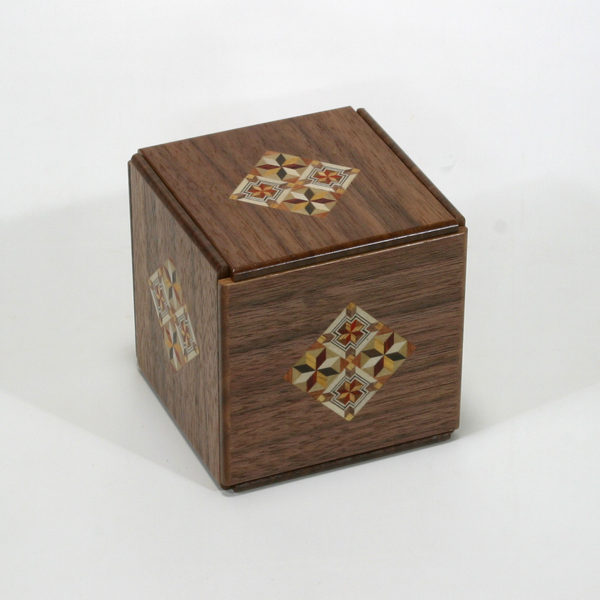 従来の秘密箱とは、構造を変えて、全部の面(6面)が動くようにしました。 12回で開きます。 秘密箱の新しい形として開発しました。