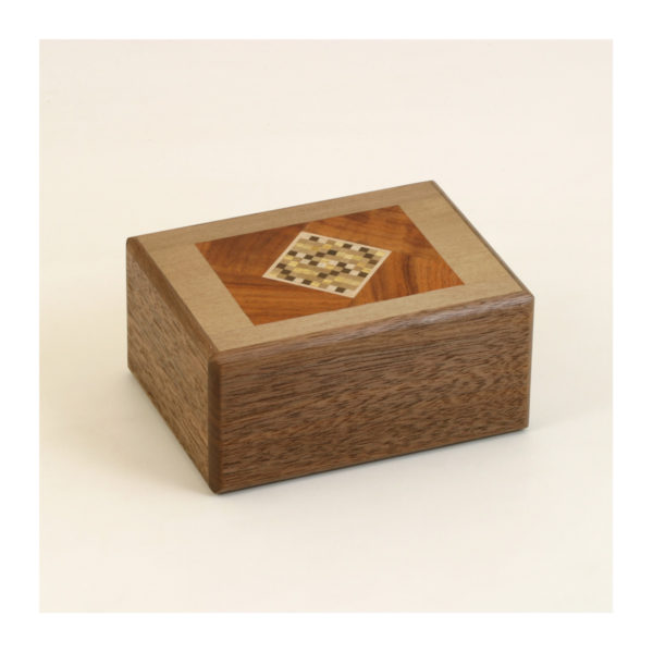 4回の秘密箱です。長手(側面の長い方)の板が、あご(側面の小さい方)の板にかぶっているのが特徴です。 サイズ 120 x 90 x 55 mm 材料 オールナット、朴、赤楠、その他
