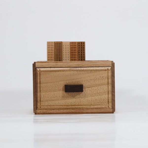 箱の上に5つのビルが並んで建っていて、それぞれのビルが上下に動かせるようになっています。