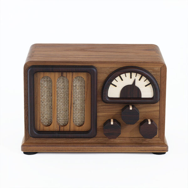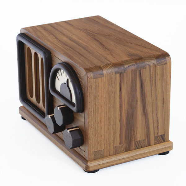 ラジオに限らず、昔の品物はより人間的で、個性が強く、自己主張が強烈だったようです。その分ちょっと調子が悪くなると、直すために悪戦苦闘させられました。それでも直れば良いのですが、直らないと頭に来て蹴とばしたりして…。すると突然直ったりして…。なんとわがままで愛らしいヤツだったことでしょう。そんな想いをからくり箱で表現してみました。