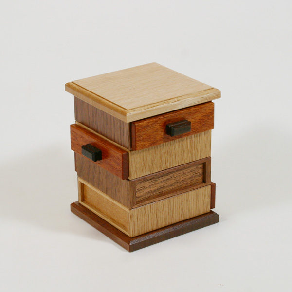 4つの引出がそれぞれ異なる4方向を向いています。一番下の引出はいつでも開きますが、他の3つには鍵がかかっています。引出をある方法で動かすと、順番に次の引出を開けて行くことが出来ます。